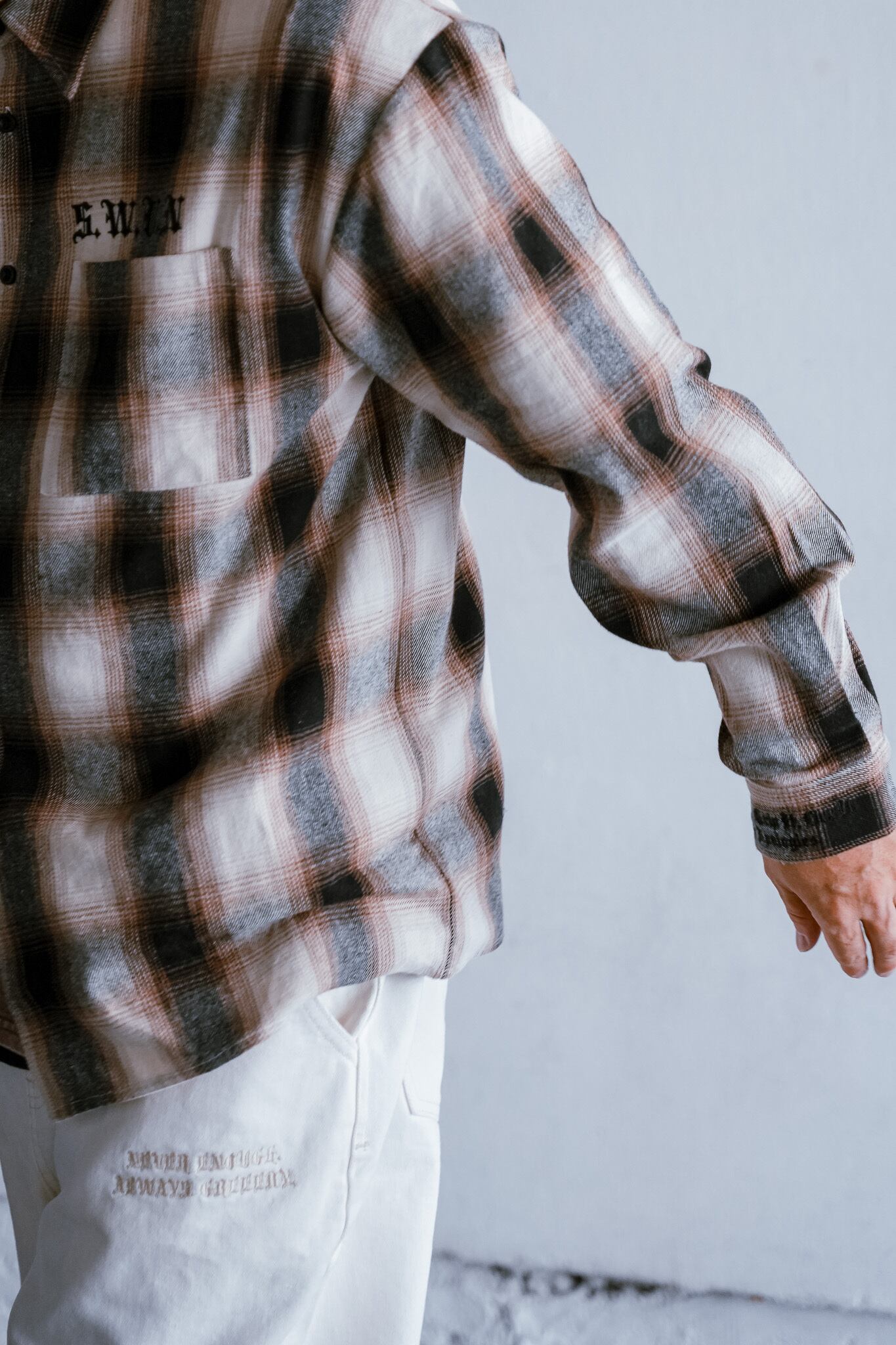 こちらのネルシャツは、質感の高い素材を使用し、バックに英文の刺繍、フロントにはブランドロゴ刺繍、袖部分にもメッセージ刺繍が施されたデザイン性の高いアイテムです。